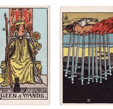 I try returning to the previous cards to see if there's new information. The Ten of Pentacles definitely wants to align with The Queen of Wands. But when I return to The Queen of Wands to get more information for Much, being in her presence makes me feel so drugged and woozy, it's intolerable to be in the resonance and I have to exit.