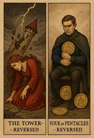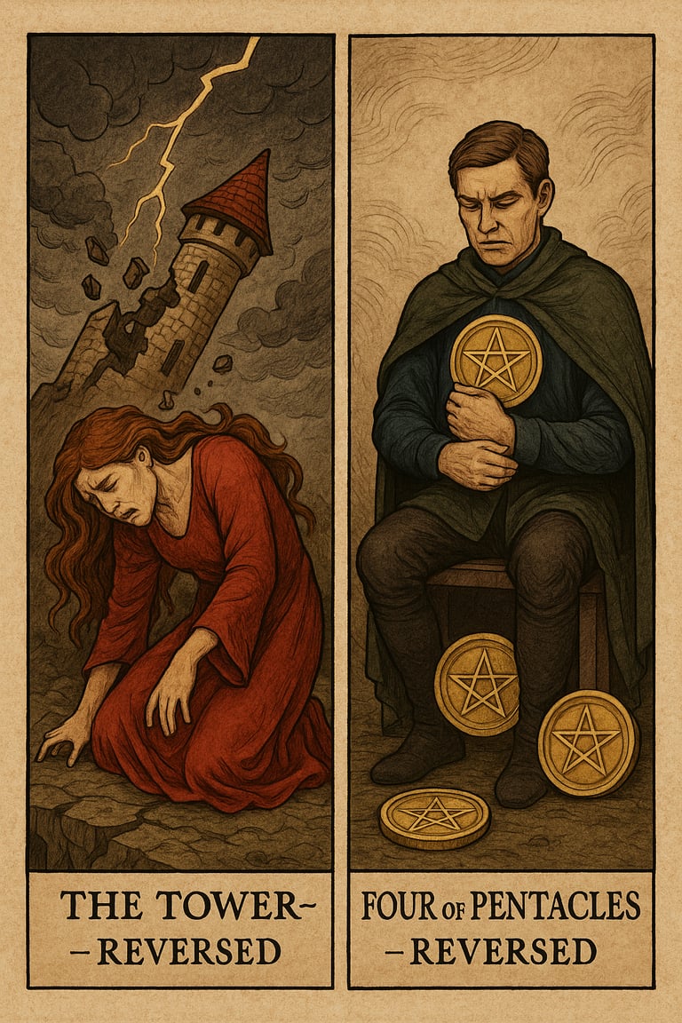 My father appears frozen — Four of Pentacles reversed - also my financial legacy - trying to hold money but failing.