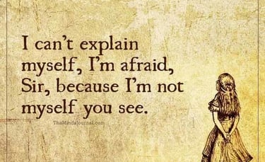 I started with Myself. It didn’t feel like a part so much as a disoriented process—a puzzle with no edges. I got a surreal image of myself searching for myself - under and over everything, frantically looking. Then energy began to rise up through my body, and suddenly it felt like my head was falling off. Disoriented, almost hallucinatory. Like being Alice in Wonderland. I wondered if I was the White Rabbit - who is myself, what is me? I puzzled, urgently. Off with her head.